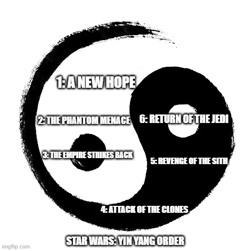 May I present to you “Star Wars: Yin Yang Order”. This is, in my opinion, the ideal way to view the first six episodes of the saga. It takes both trilogies and scrambles them together a bit. This viewing order reminds me of the way a yin yang isn’t just a circle with a white side and a black side that has a straight line dividing them (which is what you get with both release order and episodic order). The first half is the “Light father” trilogy (IV, I, V), and the second is the “Dark father” trilogy (II, III, VI).