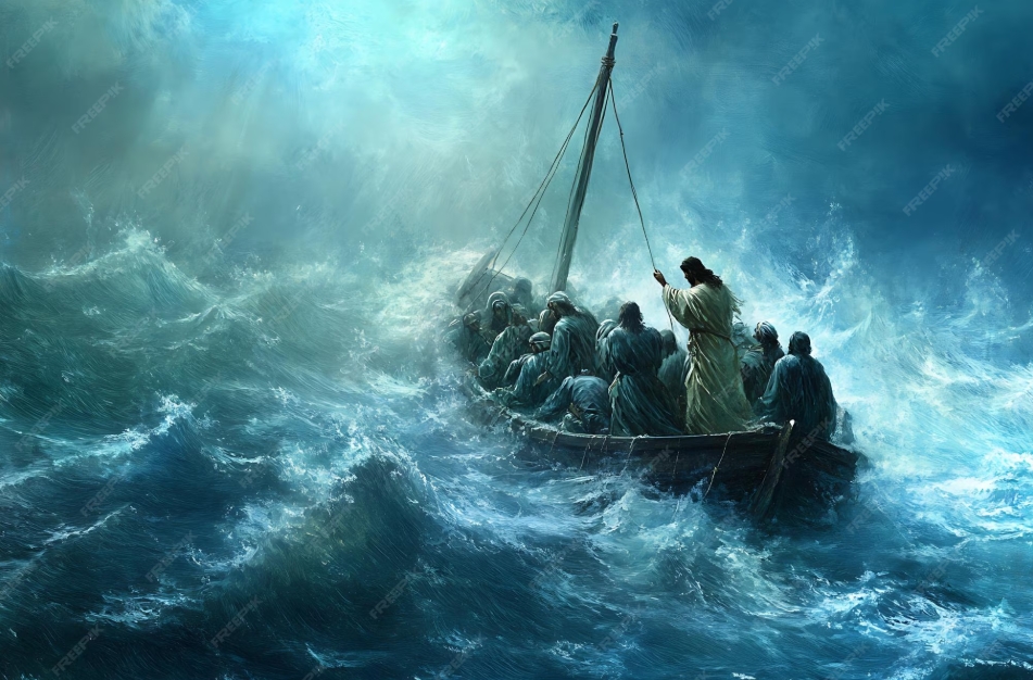 “On that day, when evening had come, he said to them, ‘Let us go across to the other side.’ And leaving the crowd behind, they took him with them in the boat, just as he was. Other boats were with him. A great gale arose, and the waves beat into the boat, so that the boat was already being swamped. But he was in the stern, asleep on the cushion; and they woke him up and said to him, “Teacher, do you not care that we are perishing?’
